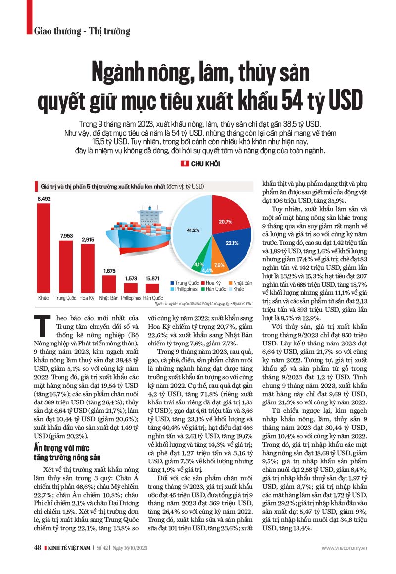 In the first nine months of 2023, agriculture, forestry and fishery product exports reached only $38.5 billion. In order to reach the annual target of $54 billion, the remaining months need to bring in an additional $15.5 billion. The Ministry of Agriculture and Rural Development (MARD) remains steadfast in reaching the target of $54 billion, which is higher than the $53.2 billion posted in 2022. However, in the current difficult context, this is no easy task, and requires determination, dynamism, and creativity from agricultural, forestry and fishery exporters to overcome the difficulties and challenges.